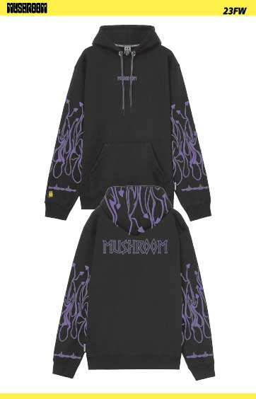 Logo stampato frontale e sul retro riprodotto in grande, funghi stampati sul cappuccio e sulle maniche