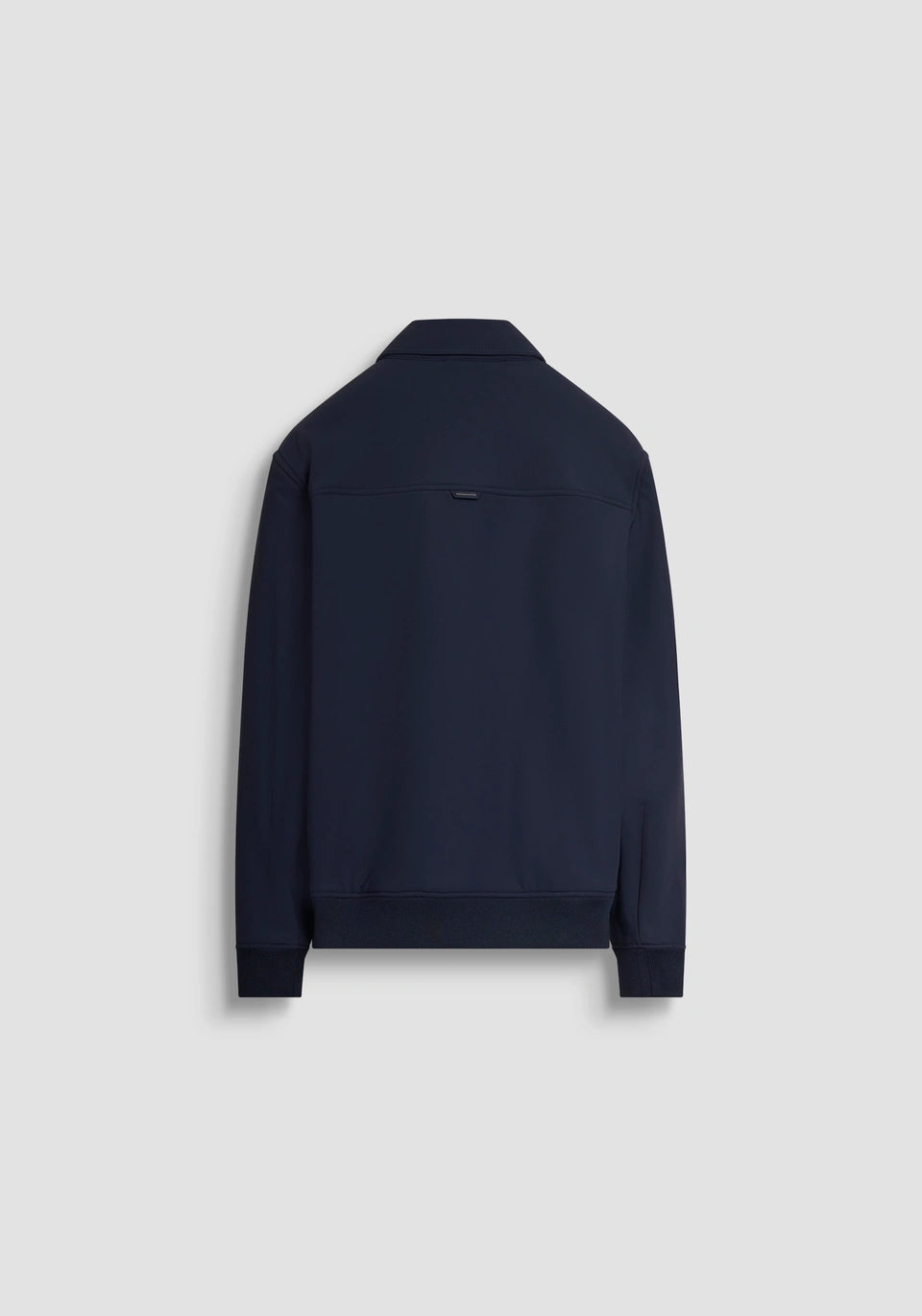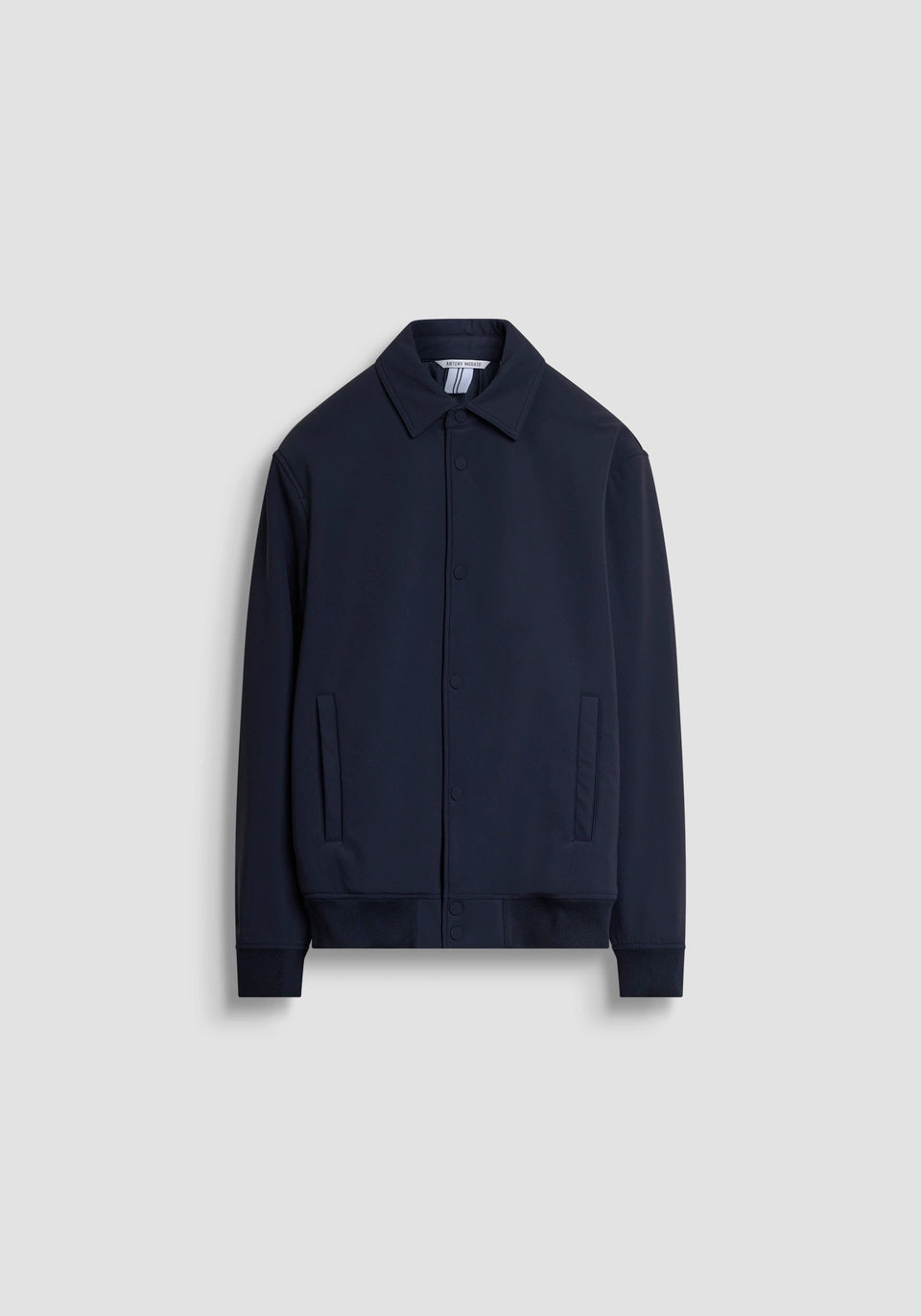 Giacca vestibilità regolare con colletto classico, realizzata in tessuto tecnico bi-stretch dal tocco morbido. Questo tessuto rende il capo confortevole da indossare e perfetto per il periodo autunnale. Inoltre, il capo è dotato di una morbida e leggera eco-imbottitura DuPont Sorona®, che è riconosciuto per le elevate prestazioni tecniche in termini di elasticità, mantenimento delle forme e soprattutto per l'elevato comfort termico. Una linea classica che riprende il modello college e lo rende elegante e lineare, perfetto da indossare in ogni occasione. Chiusura con bottoni a pressione, due tasche a filetto, polsini e fondo in maglia elastica. Sul retro, piccola linguetta con applicata una placchetta metallica logata.