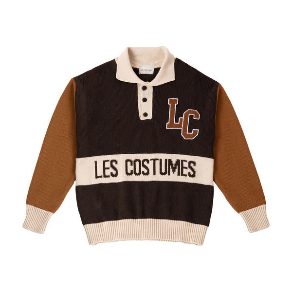 Il design presenta un colletto con abbottonatura a tre bottoni centrale e utilizzo di doppio colore per le maniche e il corpo. Al centro, logo Les Costumes in jaquard su fascia a contrasto.