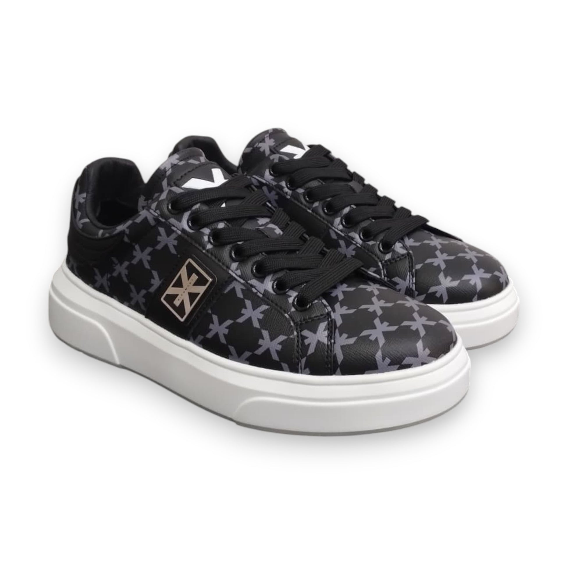 Colore Nero Pelle con fantasia loghi grigi e suola bianca.
